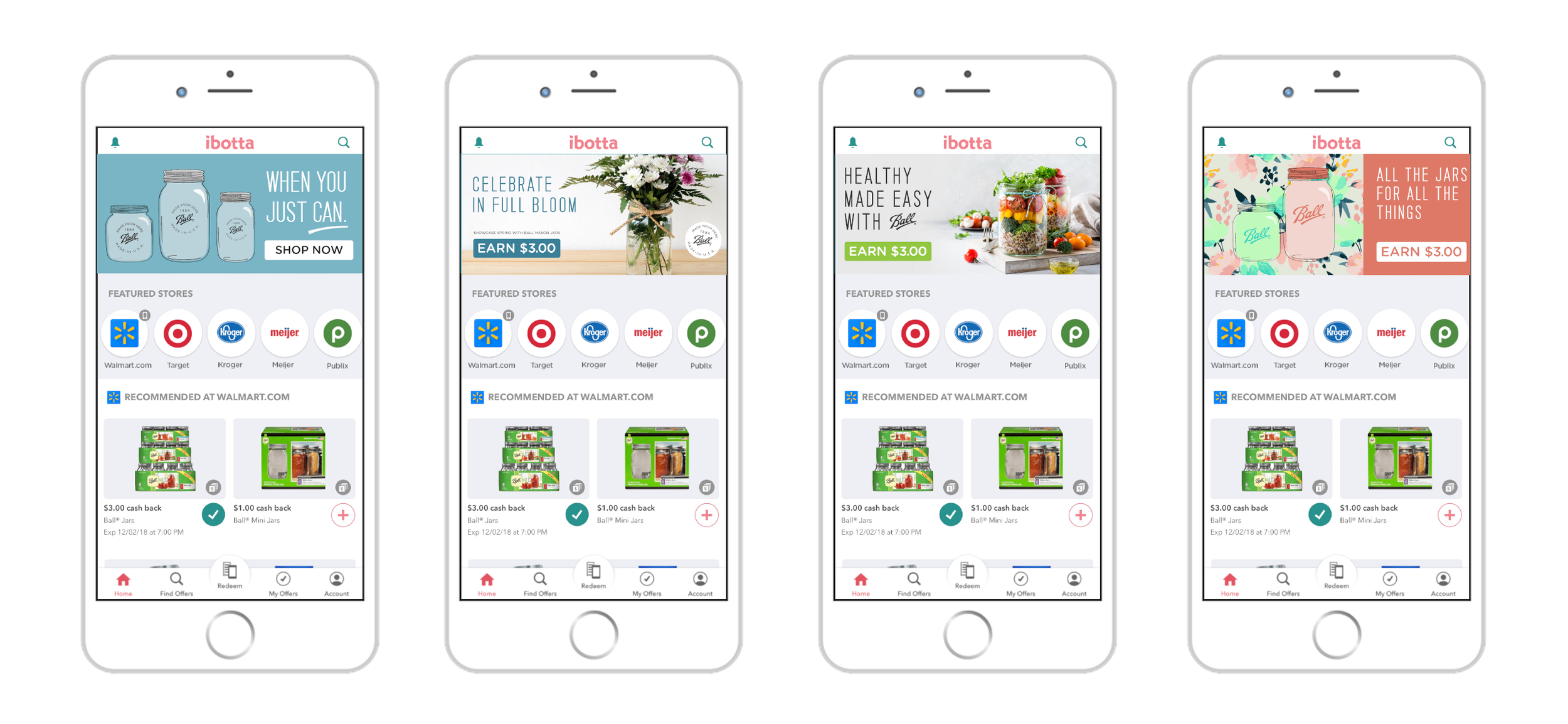 We designed iBotta tiles to lead consumers to retailers - with lightweight, fun and playful messaging that talked to canning and other easy and trendy uses of Ball jars.