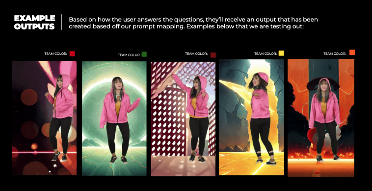 Each of our prompt questions will feed our AI-engine different results. This “perfect prompting” approach will make it so that each response affects a certain part of the greater video timeline. We developed “Buzzfeed-style” questions that would be easy for anyone to answer and relate to both Coca-Cola Zero Sugar and fans at Final Four. Because not every school is a Coke-school, we can’t use logos - but made sure to incorporate colors to help anyone make their video feel customized to them, and looked at what colors most schools would be - so they’d all be covered.